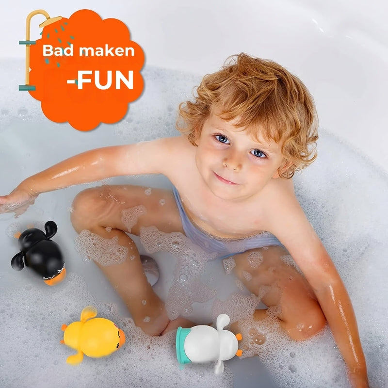 Opwinden en wegwezen: Wind de eendjes op en laat ze dan los in het water om ze met hun vinnen te zien klapperen en door het water te zien bewegen, waardoor je kleintjes giechelen van plezier.