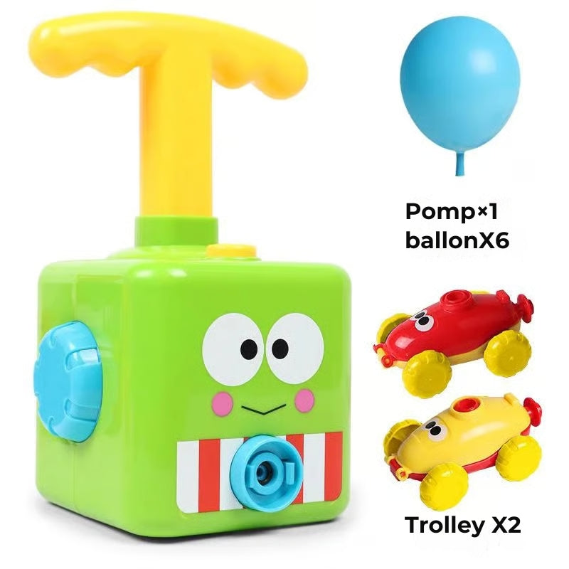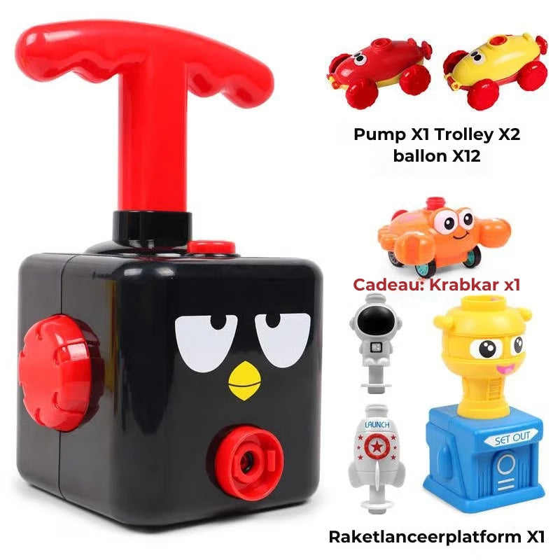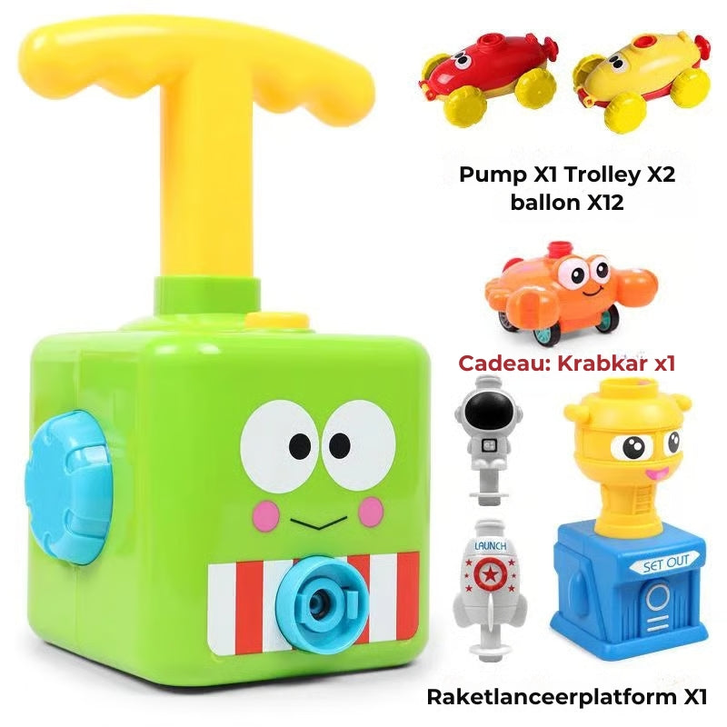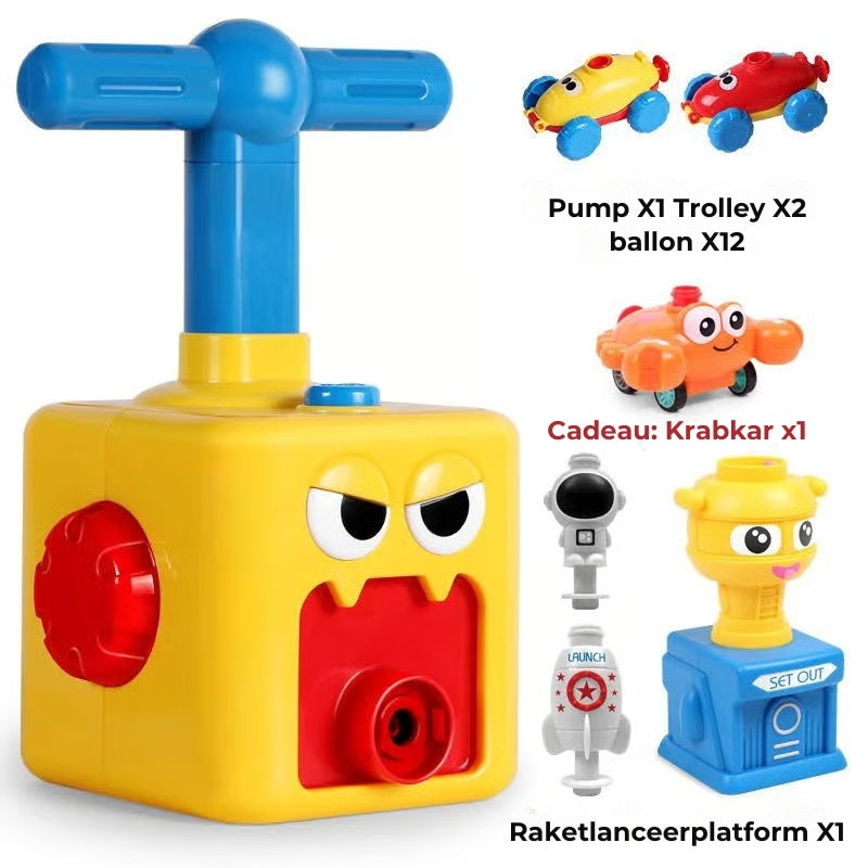 Dit speelgoed bestaat uit vier onderdelen: de pomp, de auto's, de ballonnen en de extra's (afhankelijk van het gekozen pakket). De ballon wordt aan de auto bevestigd en aan de pomp gekoppeld. Met de hendel kan de ballon worden opgeblazen. Ten slotte drukt u op de knop van de pomp, waardoor een kleine hoeveelheid lucht uit de ballon vrijkomt. De auto rijdt dan vooruit. Het kind leert hier de derde bewegingswet van Isaac Newton: voor elke actie is er een gelijkwaardige tegengestelde reactie. De lucht wordt uit de achterkant van de auto geduwd terwijl deze vooruit rijdt! Natuurkunde was nog nooit zo eenvoudig.