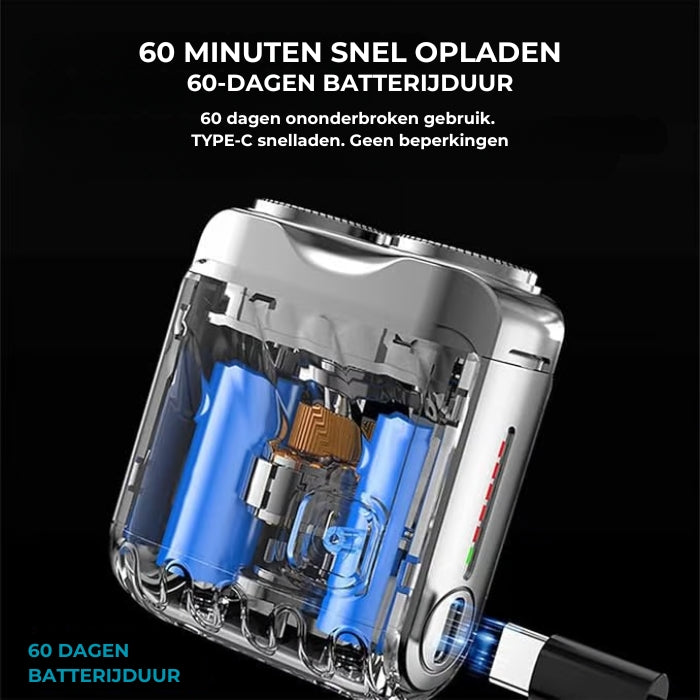 60 dagen stroom met slechts 1 uur opladen ⏱️🔋 Zeg maar dag tegen het dagelijks opladen! Laad slechts 1 uur op en geniet van 60 scheerdagen - perfect voor lange reizen of drukke schema's.