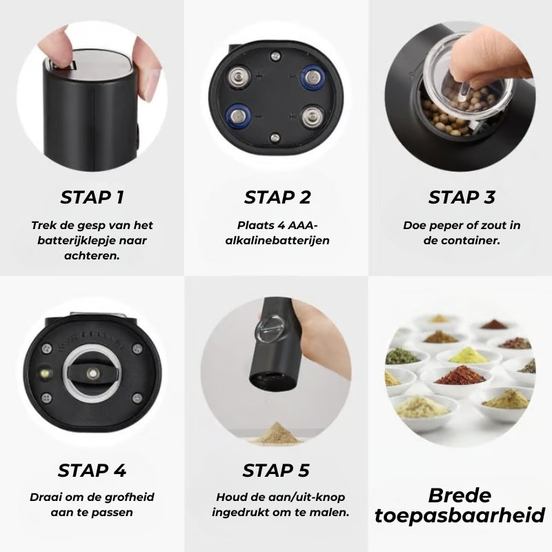 Automatische LED-verlichting: De LED-verlichting wordt automatisch geactiveerd tijdens gebruik, waardoor uw gerechten worden verlicht en u ze nauwkeurig kunt kruiden.