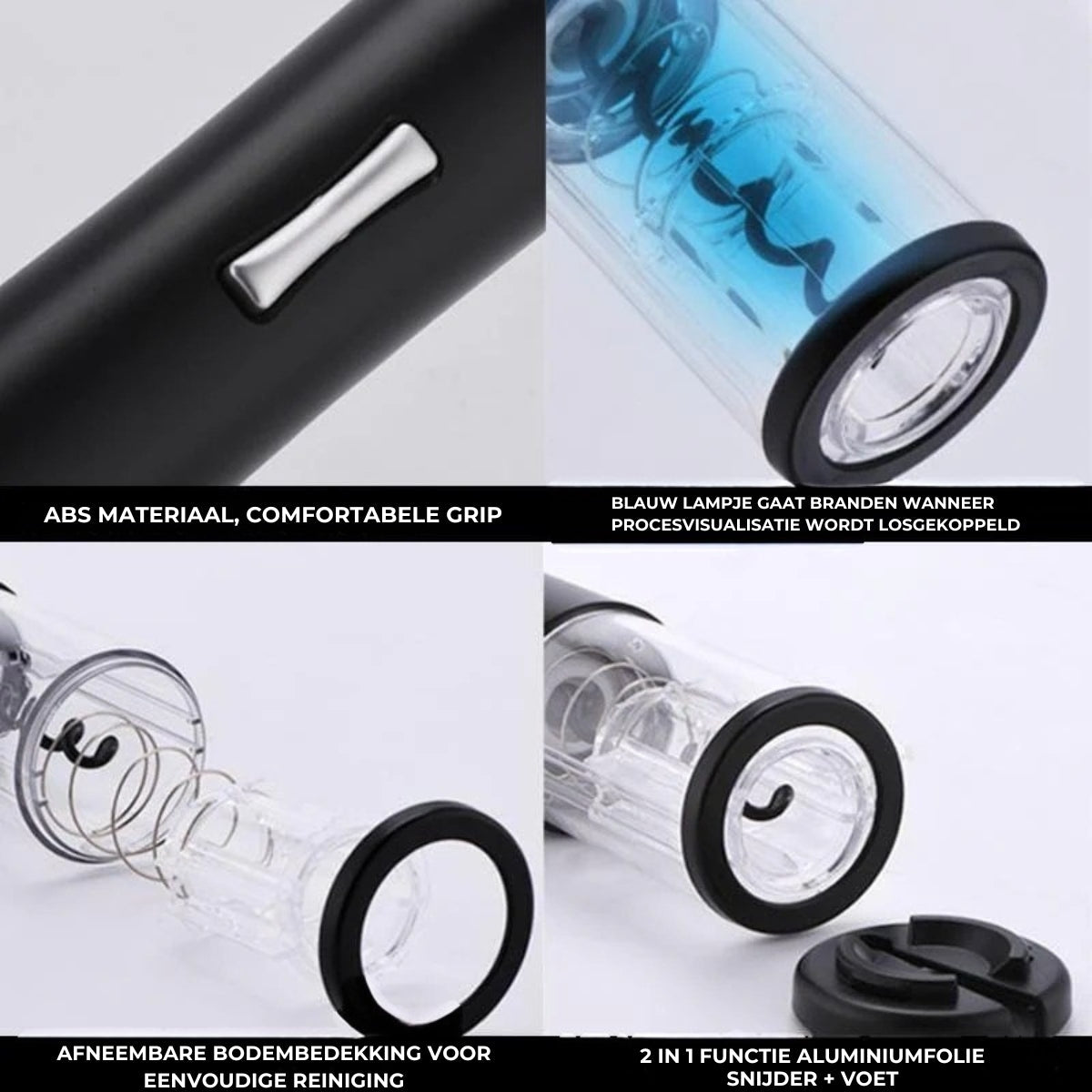 ✔ Eenvoudige bediening – opent je wijnfles in slechts 5 seconden ✔ Ingebouwde foliesnijder – verwijdert moeiteloos de folie en kan netjes aan de onderkant van de opener worden opgeborgen ✔ Transparant omhulsel – volg het kurkverwijderingsproces voor een visuele ervaring