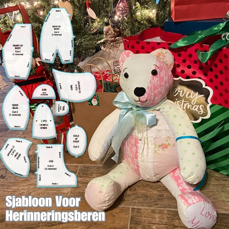 Herinneringsbeerset gediend om een lieve knuffelbeer te maken van de kleding van een overleden dierbare om hun herinnering levend te houden of van kinderkleding om herinneringen aan hun kindertijd te bewaren. *Handgemaakt met behulp van knuffelbare patroonsjablonen.