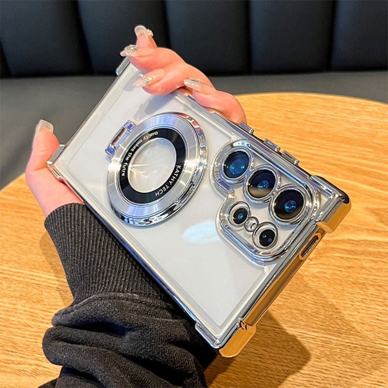 MAGNETISCHE HOES MET ONZICHTBARE STANDAARD: Dit is een nieuwe serie met een magnetische ring en een standaardfunctie voor de telefoon. In geopende toestand houdt de geïntegreerde magnetische aluminiumring de mobiele telefoon stabiel in staande of liggende stand, en in gesloten toestand is de achterkant volledig onzichtbaar (de mobiele telefoon kan toch magnetisch worden opgeladen). Ideaal voor gebruik op het bureau of overal waar u werkt of media consumeert!
