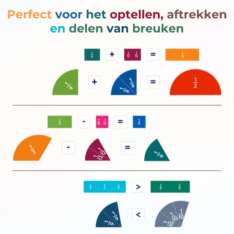 Leuke breukeneducatie Deze set is ontworpen voor het leren van breuken op een leuke en eenvoudige manier. De set wordt geleverd met een pen waarmee tijdens het leren kan worden getekend en gewist.