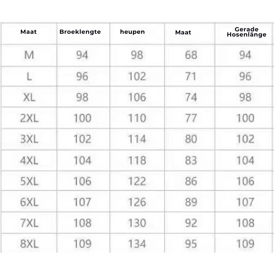 Opmerking: Omdat het materiaal van deze broek erg rekbaar is, raden we je aan een maat groter te kiezen als je de voorkeur geeft aan een lossere stijl.